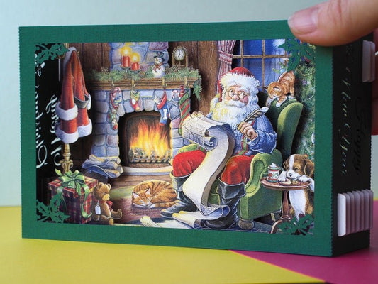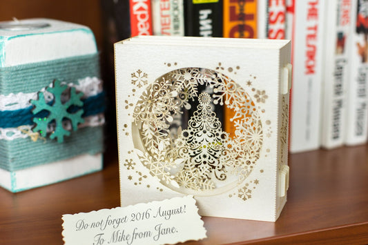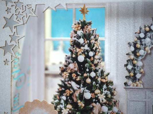 Christmas house 2023. Paper pop up card. Fireplace miniature, Christmas Tree. Laser cut box gift.