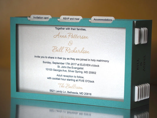 Pop up stationery. USA wedding invitations. Hammond Castle. Massachusetts. Paper box miniature. RSVP inserts. Custom text.