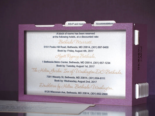 Mission Inn Hotel and Spa wedding invitations. Custom design. Paper pop up box card, RSVP inserts. USA Hotel Wedding venue invites stationary.
