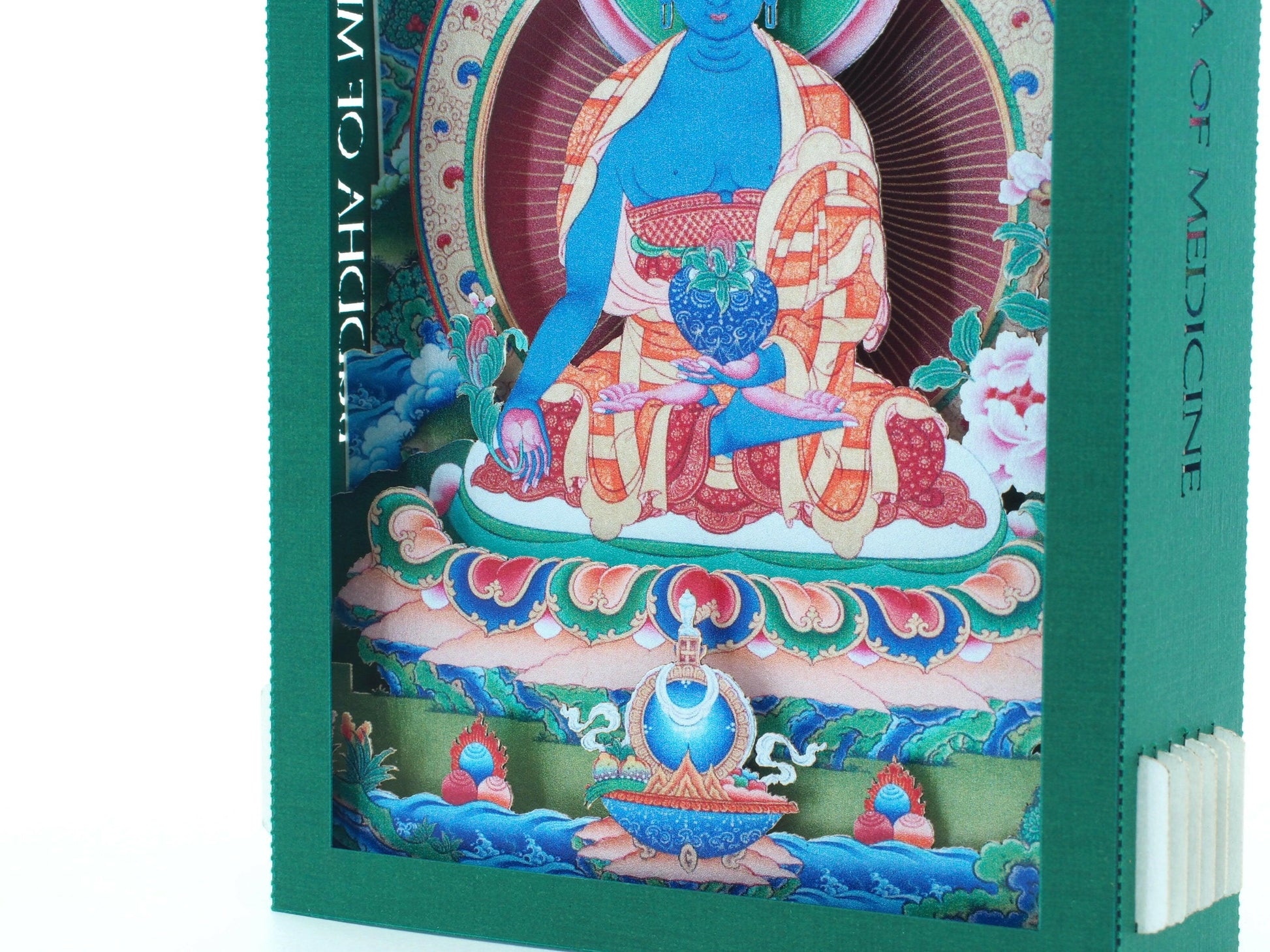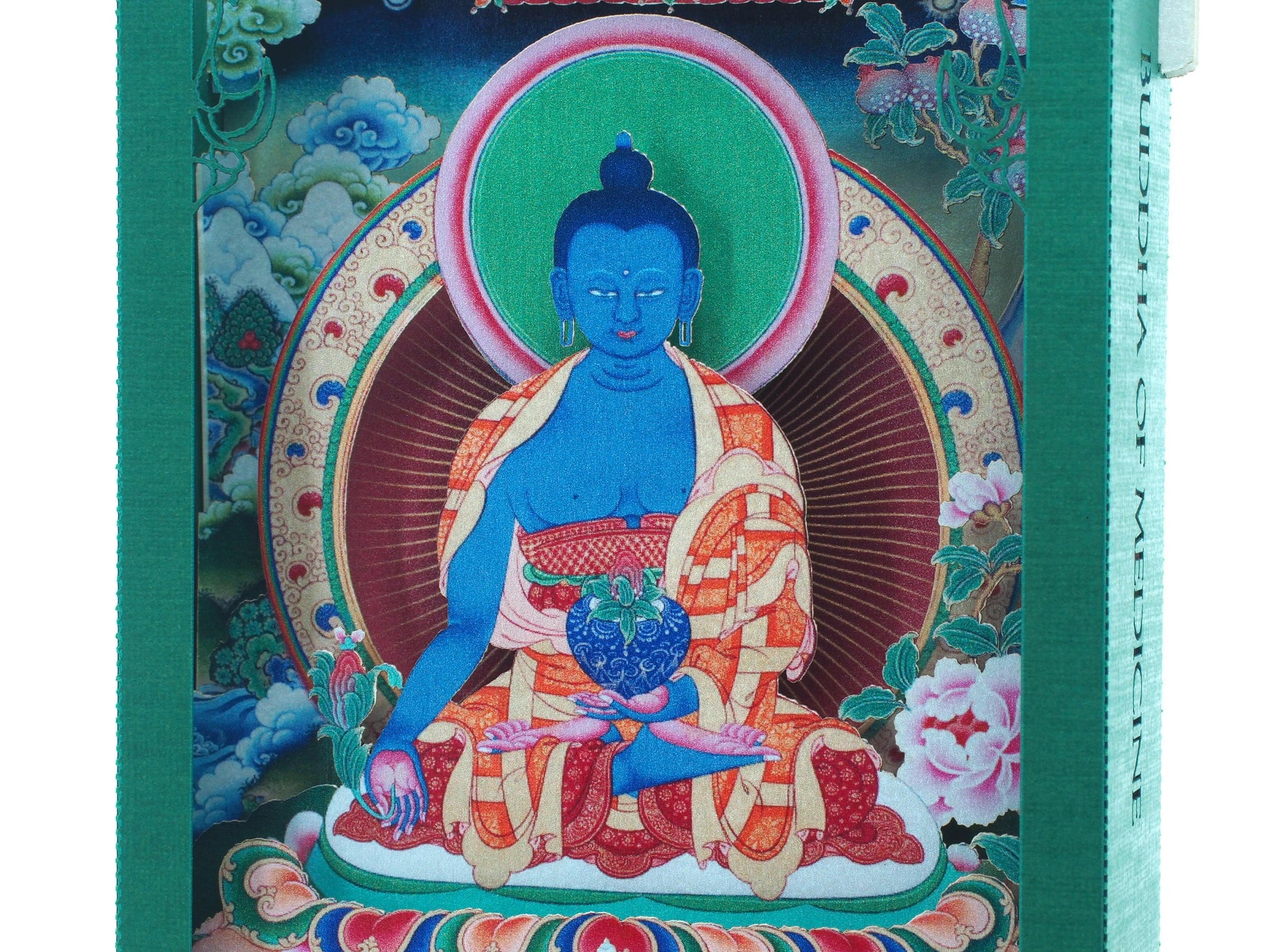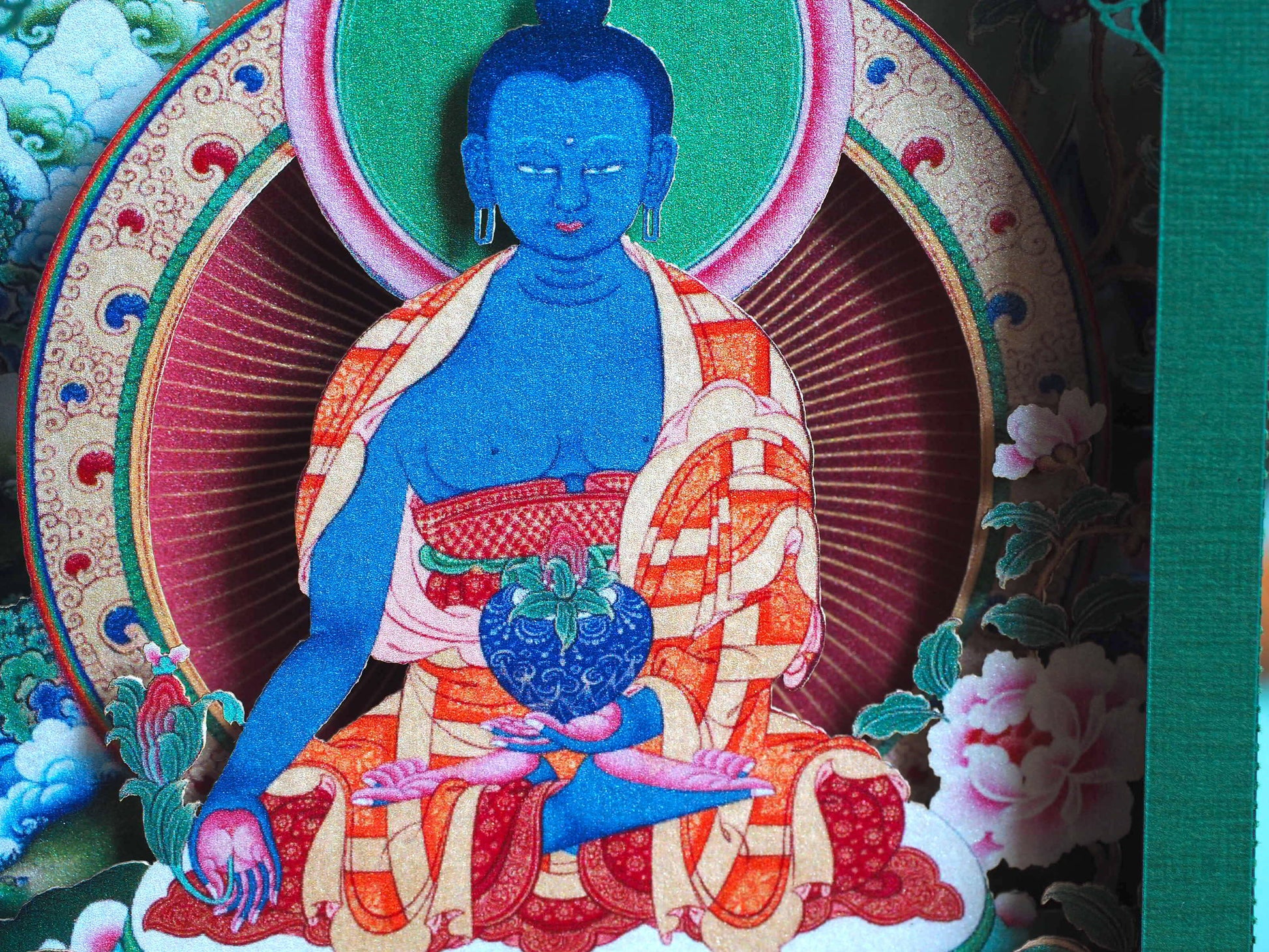 Buddha of Medicine. Pop up paper box card folded. Yoga, meditation. Spiritual, religious.