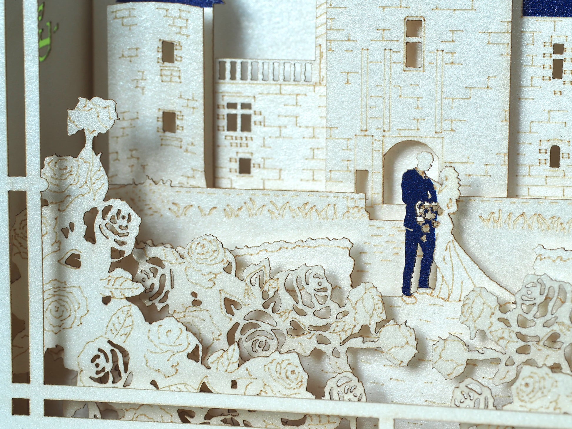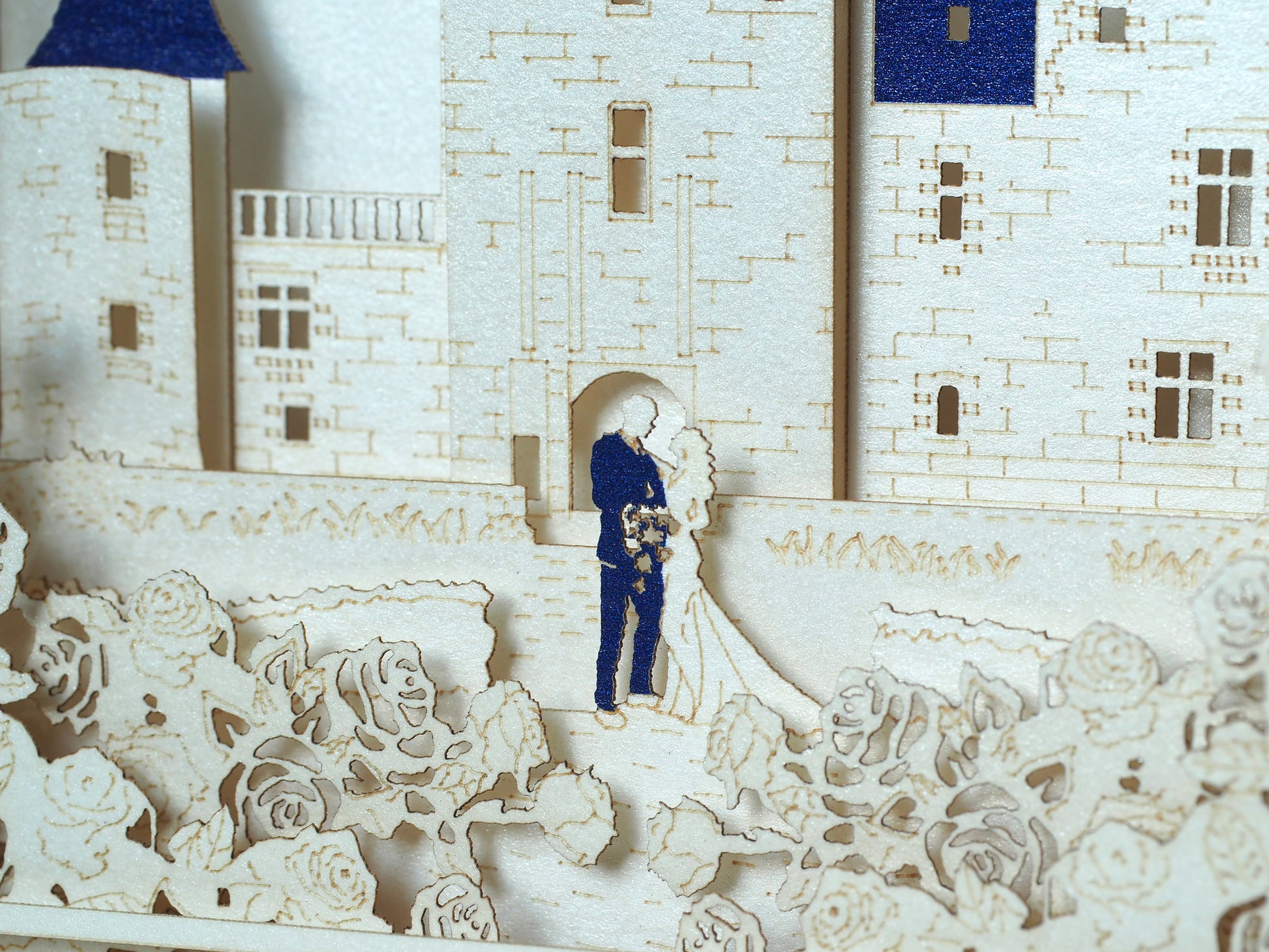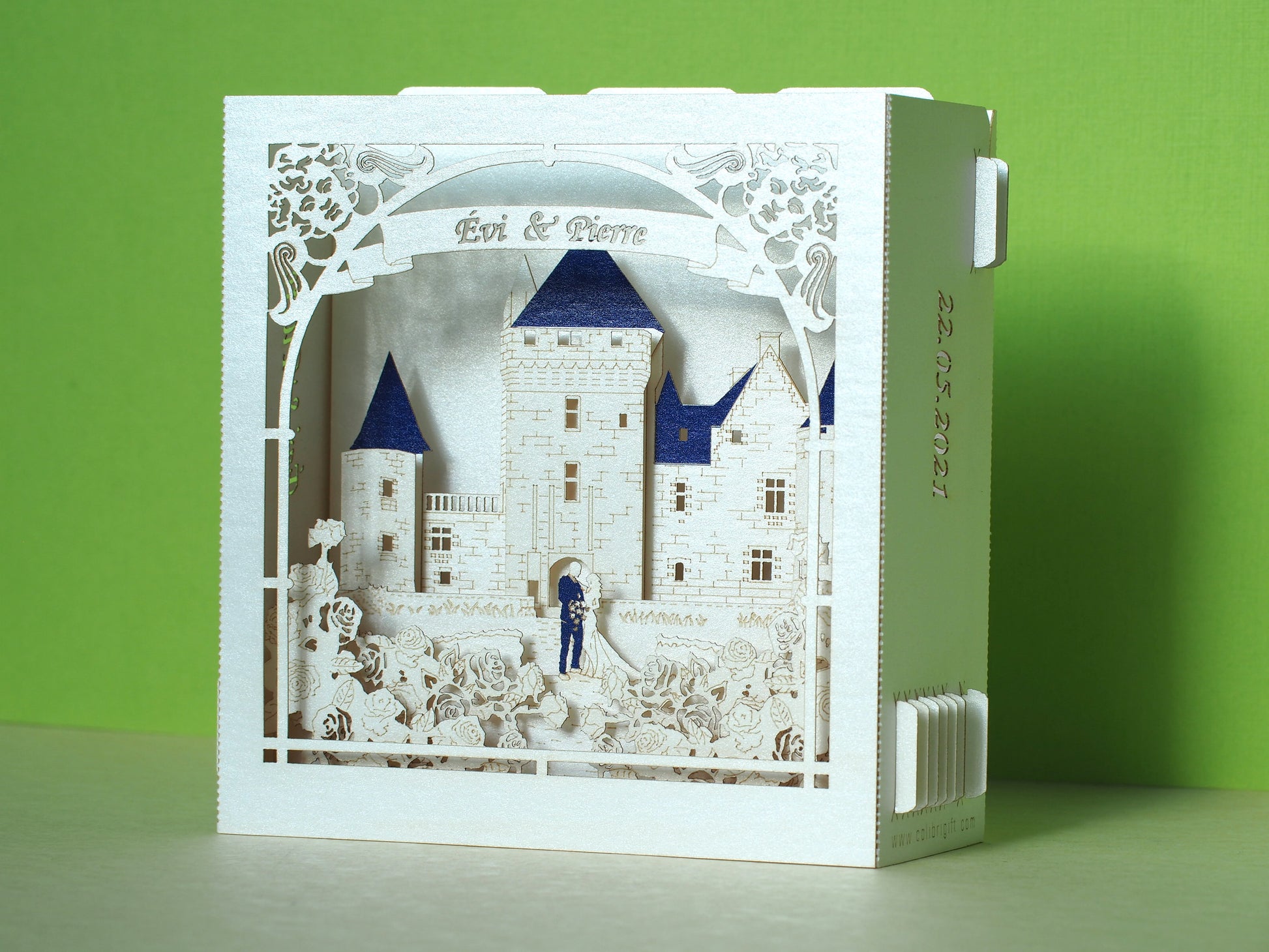 This charming paper scale model of wedding invitation pop-up card is one of the kind. It is a luxury patented gift card, individually handmade to your order.