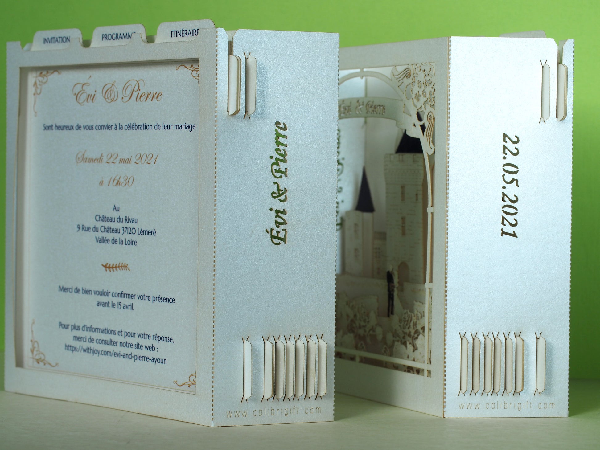 Château du Rivau castle-palace in Lémeré France. Wedding invitation card, RSVP inserts. Paper pop up cards