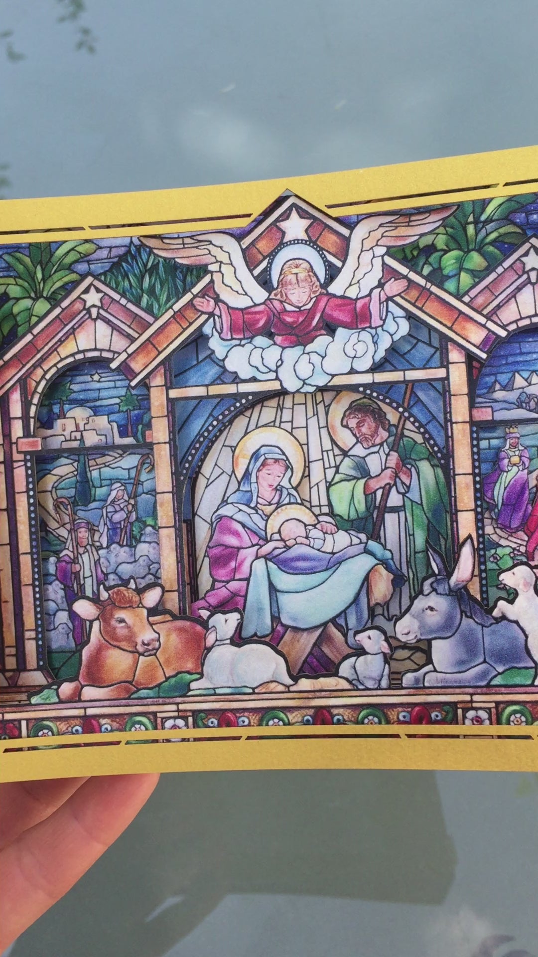 Christmas Nativity Holy Night Scene. Paper 3d laser cut box card. Baby Jesus, Mother Mary, Joseph, three Kings, animals, Holy Star, Angel. Pop up card. Model miniature.
