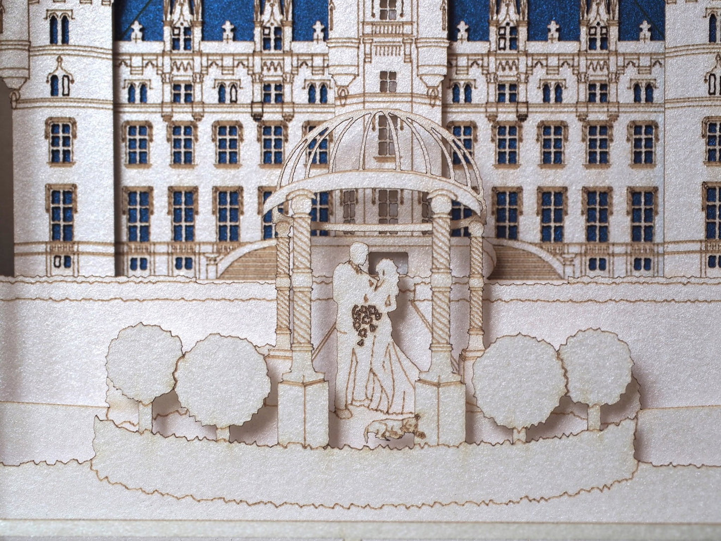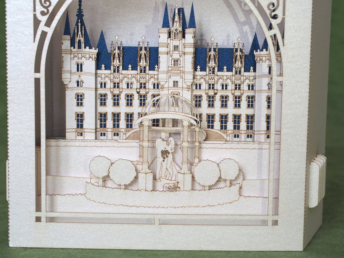 This charming paper scale model of wedding invitation pop-up card is one of the kind. It is a luxury patented gift card, individually handmade to your order.