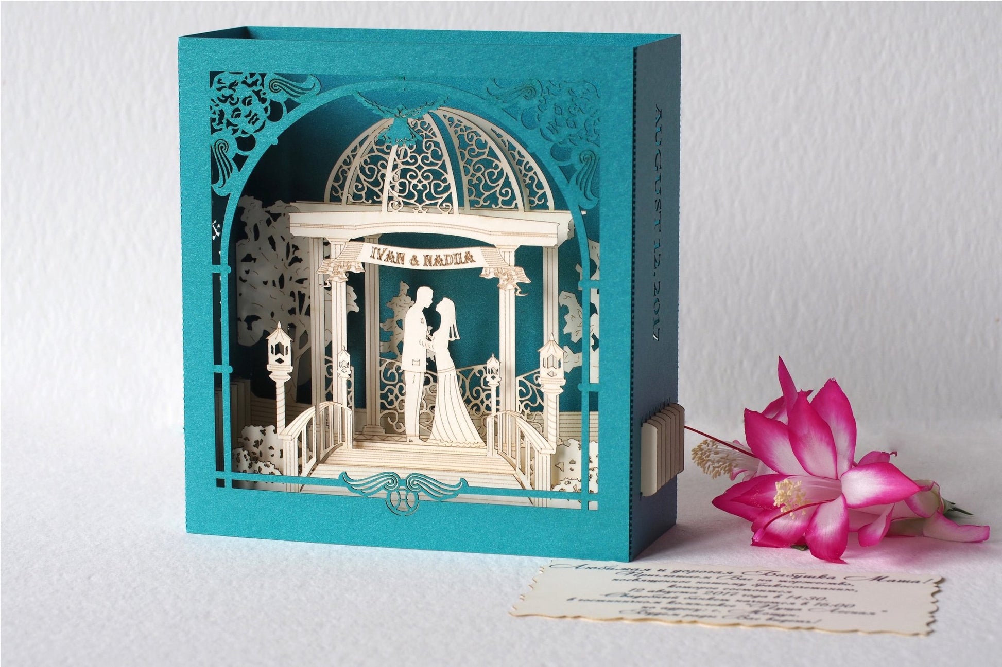 This charming paper scale model of the wedding invitation pop-up card is one of the kind. It is a luxury patented gift card, individually handmade to your order.